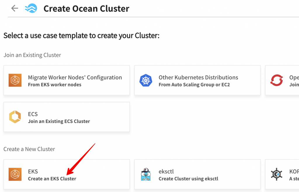 2. When the Create Ocean Cluster page appears, you must choose a use case template. Under Create a New Cluster, click Create an EKS Cluster.